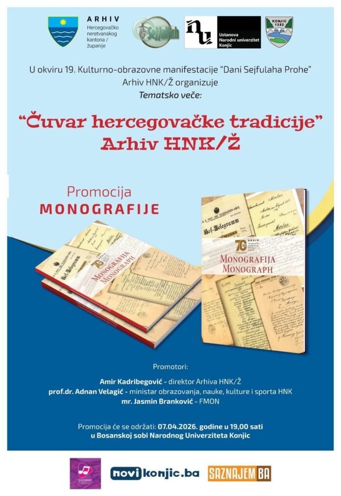 U okviru 19. kulturno-obrazovne manifestacije “Dani Sejfulaha Prohe” održat će se tematsko veče pod nazivom “Čuvar hercegovačke tradicije”. Centralni događaj večeri predstavlja promocija prve monografije Arhiva HNK/Ž pod nazivom “Arhiv Hercegovačko-neretvanskog kantona/županije 1954.–2024.”.