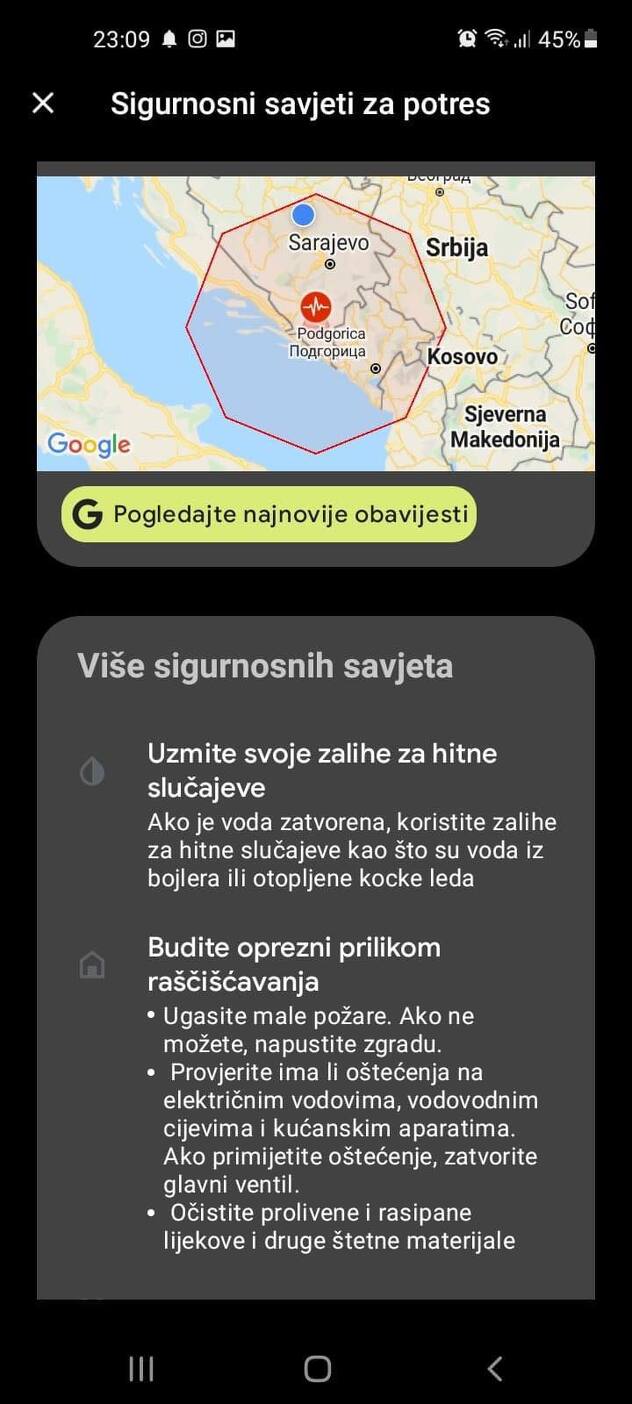 Androidov sistem upozorenja o zemljotrsu je poslao jasnu poruku da građani budu u pripravnosti, da su naknadni potresi uobičajeni tokom smirivanja tla te sa smjernicama šta uraditi nakon potresa.
