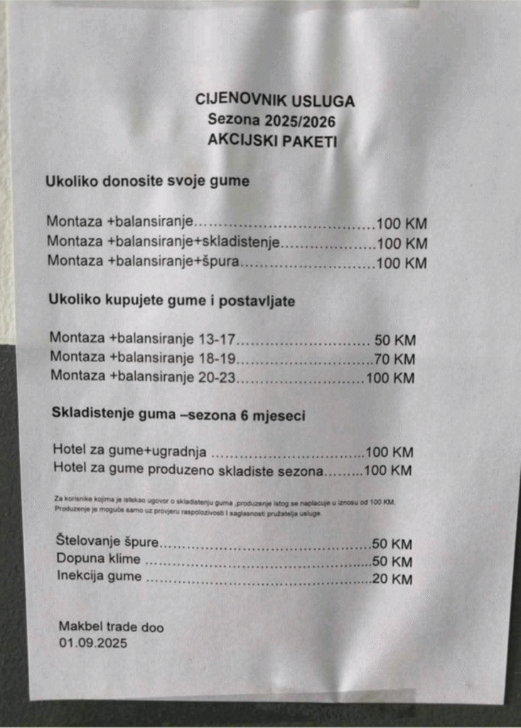 - Montaža s čuvanjem guma („hotel za gume“) – 6 mjeseci: 130 do 150 KM