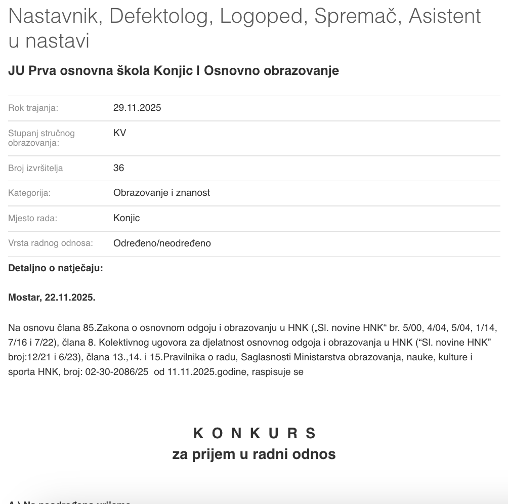 JU Prva osnovna škola Konjic objavila je konkurs za prijem radnika na određeno i neodređeno vrijeme, u skladu sa saglasnošću resornog ministarstva i važećim propisima. Konkurs obuhvata više nastavnih i nenastavnih pozicija, a odnosi se na različite vrste angažmana.