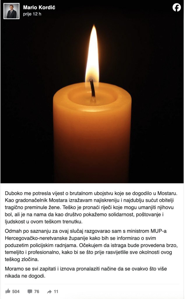“Duboko me potresla vijest o brutalnom ubistvu koje se dogodilo u Mostaru. Kao gradonačelnik Mostara izražavam najiskreniju i najdublje saučešće porodici tragično preminule žene. Teško je pronaći riječi koje mogu umanjiti njihovu bol, ali je na nama da kao društvo pokažemo solidarnost, poštovanje i ljudskost u ovom teškom trenutku.