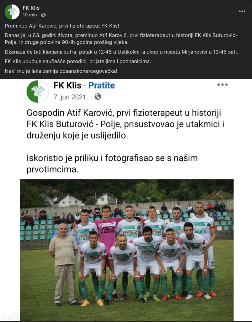 FK Klis Buturović–Polje oprostio se od svog dugogodišnjeg saradnika i prijatelja Atifa Karovića, prvog fizioterapeuta u historiji kluba, koji je preminuo u 63. godini života.