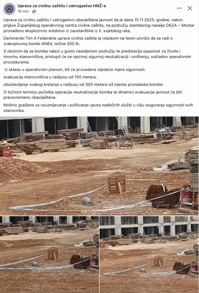 Uprava za civilnu zaštitu i vatrogastvo Hercegovačko-neretvanskog kantona obavijestila je javnost da je na području stambenog naselja Oaza u Mostaru pronađeno eksplozivno sredstvo zaostalo iz Drugog svjetskog rata.
