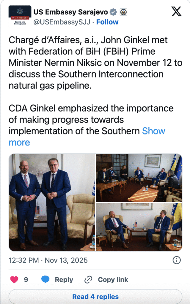 Ginkel je naglasio važnost postizanja napretka u implementaciji Južne interkonekcije, kao što je potvrđivanje Komisije za urbanističko planiranje i priprema međuvladinog sporazuma između BiH i Hrvatske o podršci uvozu američkog plina preko Hrvatske potrošačima u Bosni i Hercegovini.