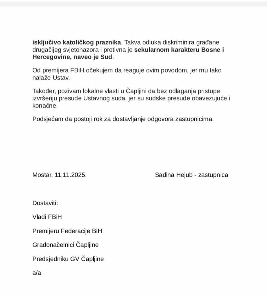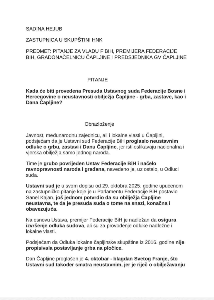 Kantonalna zastupnica Sadina Hejub istaknula je da je danas službeno uputila zastupničko pitanje Vladi Federacije BiH, gradonačelniku Čapljine i predsjedniku Gradskog vijeća. Njeno pitanje, kako je navela, tiče se provedbe odluke Ustavnog suda Federacije BiH, koja je jasno utvrdila neustavnost obilježja Čapljine.