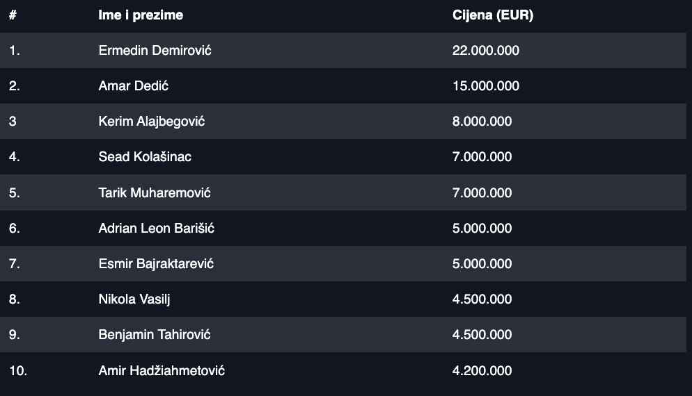 U nastavku u tabeli pogledajte kako trenutno izgleda poredak TOP 10 najskupljih bh. reprezentativaca.
