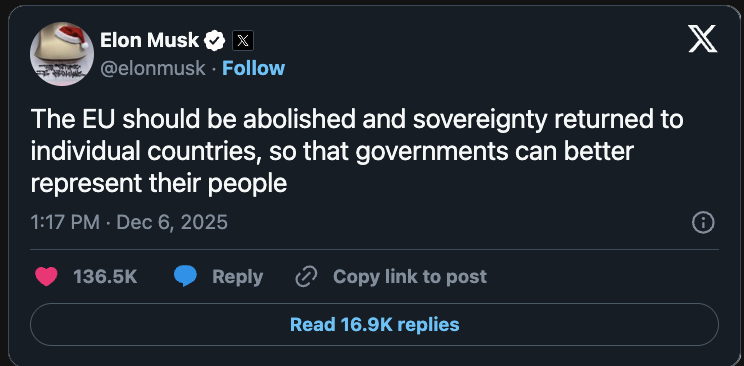 Zamjenik predsjednika ruskog Vijeća sigurnosti Dmitri Medved podržao je Ilona Maska u objavi gdje je pozvao na ukidanje Evropske unije i vraćanje suverenosti državama.