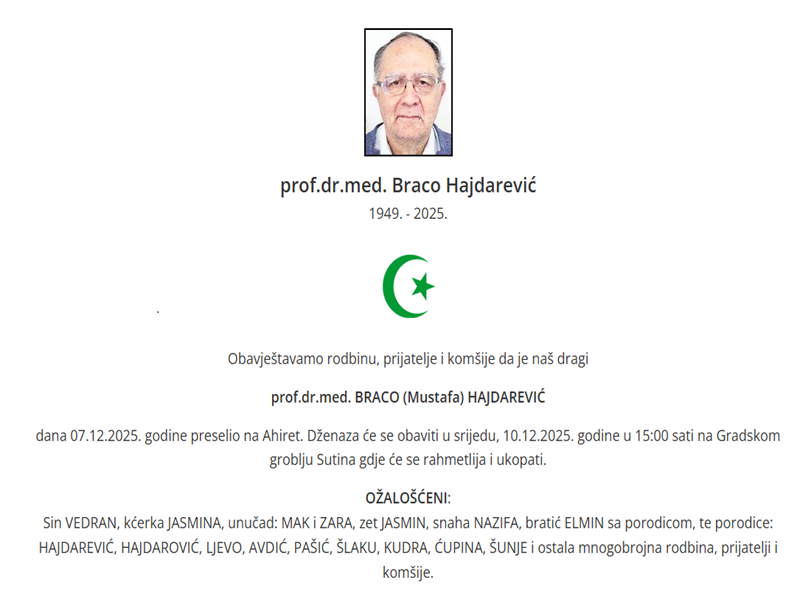 Dženaza doktoru Hajdareviću bit će održana u srijedu, 10. decembra, s početkom u 15 sati, na Gradskom groblju Sutina u Mostaru.