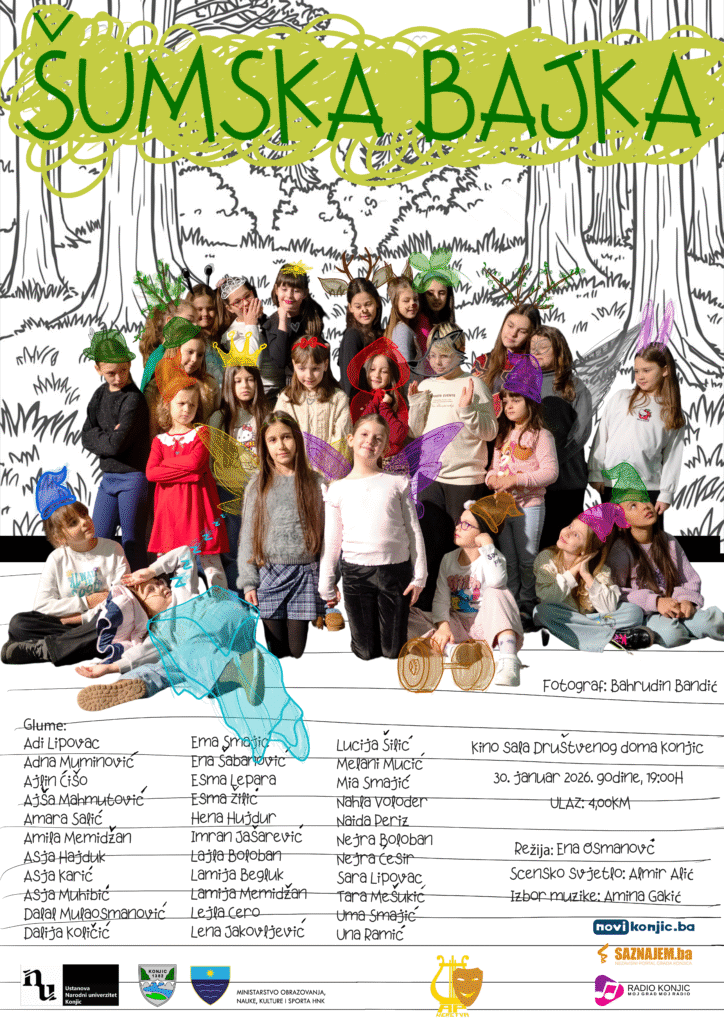 Premijera predstave „Šumska bajka“ bit će održana u petak, 30. januara 2026. godine, u Kino sali Društvenog doma u Konjicu, sa početkom u 19:00 sati. Cijena ulaznice iznosi 4,00 KM.