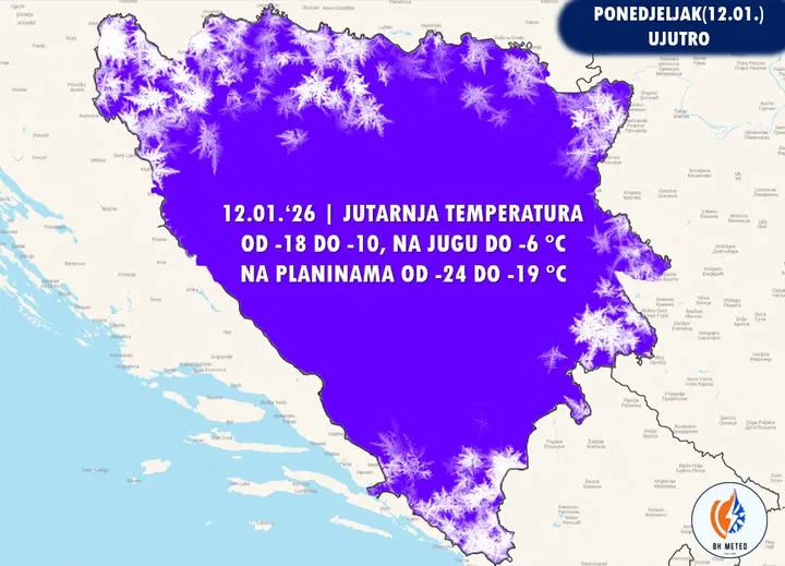 U noći na ponedjeljak slijedi postepeno razvedravanje u cijeloj zemlji. Zbog razvedravanja i slabljenja vjetra, ponedjeljak će donijeti izrazito hladno jutro, s temperaturama od minus 18 do minus 10 stepeni, dok će na jugu biti do minus šest. U planinskim predjelima i mrazištima moguće su temperature i do minus 24 stepena.