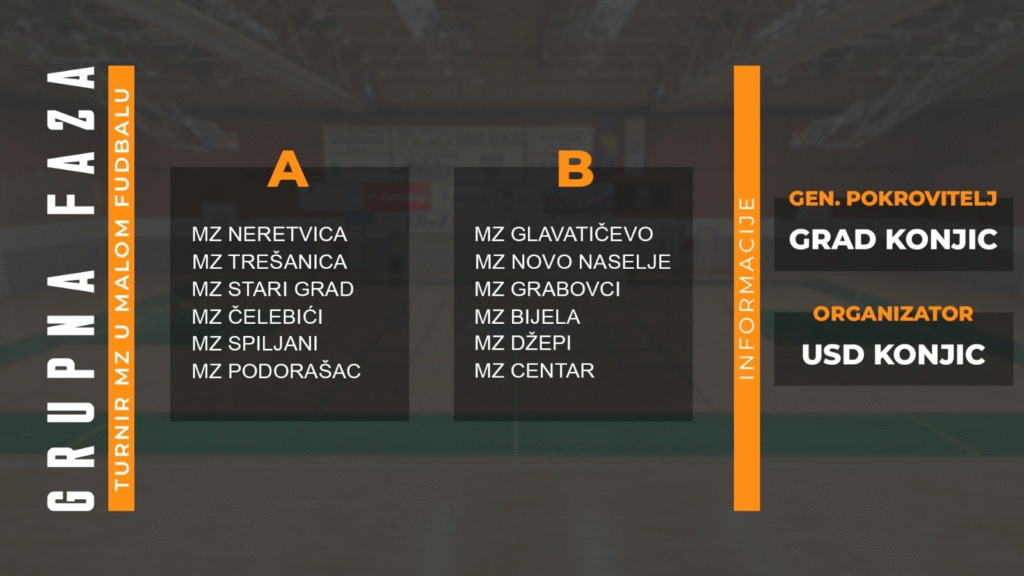 Konjic će večeras biti domaćin jednog od najznačajnijih sportskih događaja u gradu – Turnira mjesnih zajednica u malom fudbalu, koji i ove godine okuplja najbolje ekipe iz mjesnih zajednica s područja grada Konjica. Turnir se održava u organizaciji USD Konjic, uz generalno pokroviteljstvo Grada Konjica.