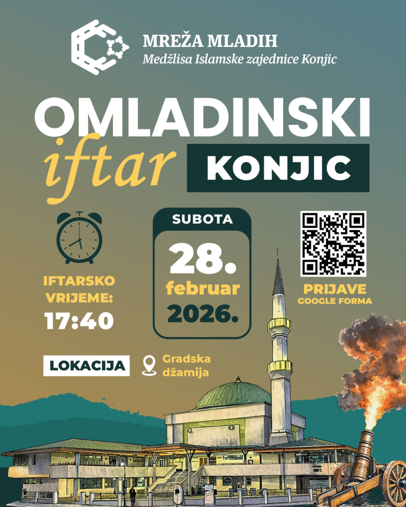 Mreža mladih Medžlisa Islamske zajednice Konjic organizuje Omladinski iftar – Konjic 2026, koji će biti održan u subotu, 28. februara 2026. godine, u prostoru Gradske džamije u Konjicu.