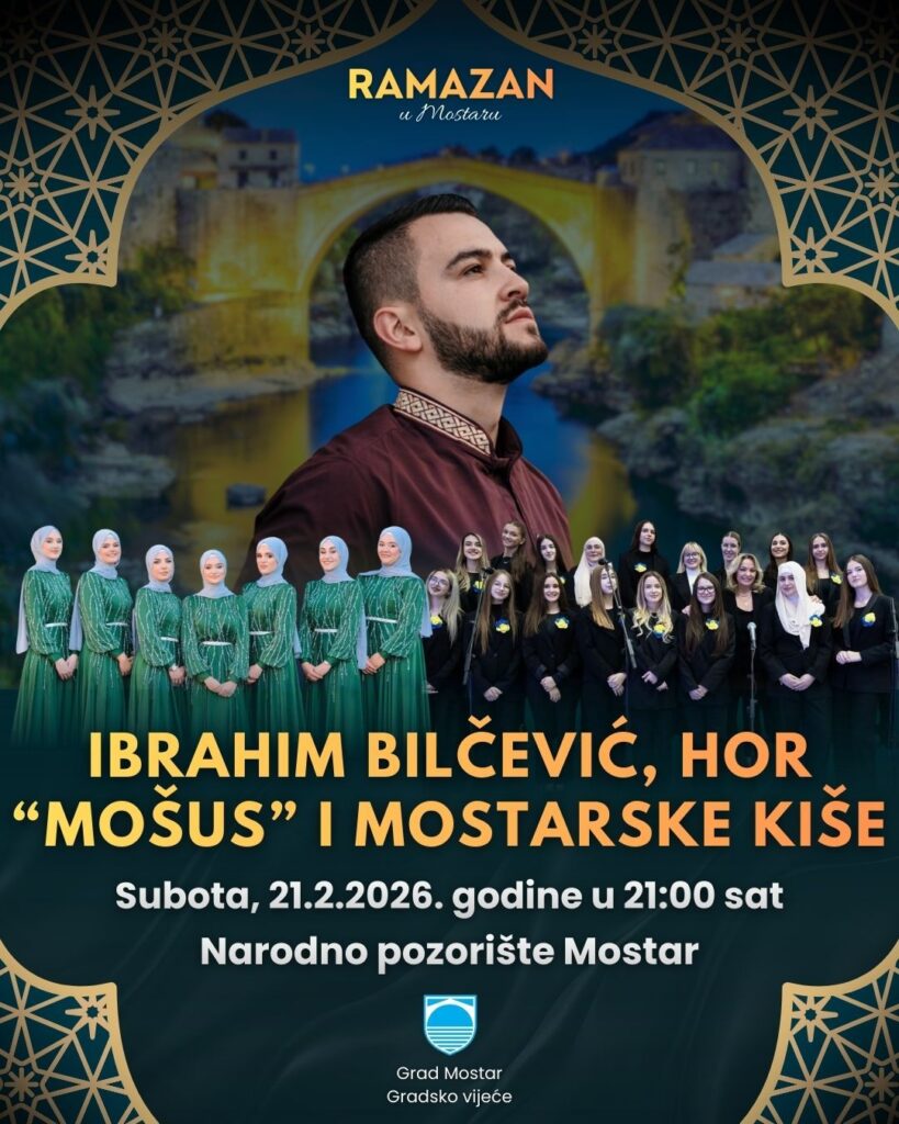 Koncert će se održati s početkom u 21:00 sat a nastupiti će Ibrahim Bilčević, ansambl Mostarske kiše i hor Mošus.
