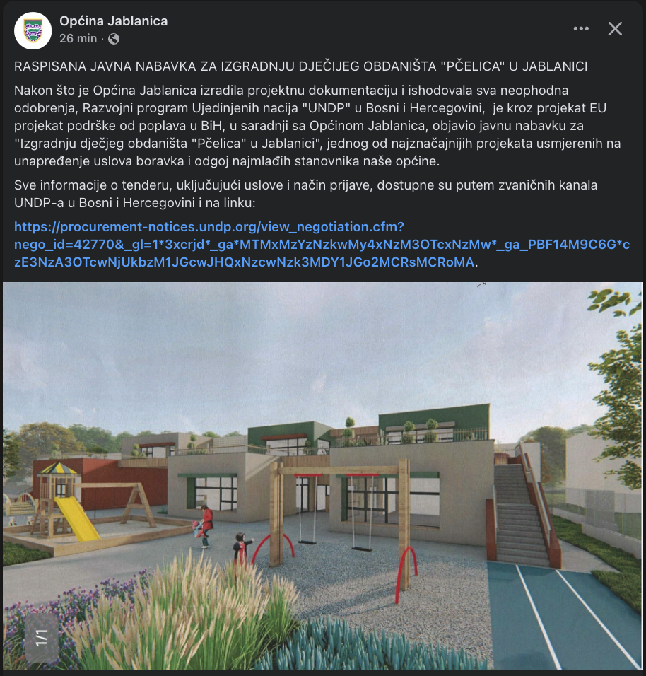 Razvojni program Ujedinjenih nacija (UNDP) u Bosni i Hercegovini, kroz EU projekat podrške oporavku od poplava u BiH, a u saradnji s Općinom Jablanica, raspisao je javnu nabavku za izgradnju dječijeg obdaništa „Pčelica“ u Jablanici.