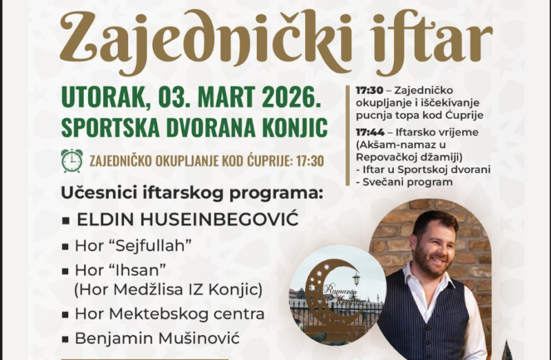 Grad Konjic, pod pokroviteljstvom Turske agencije za saradnju i koordinaciju (TIKA) i u partnerstvu sa Medžlisom Islamske zajednice Konjic, organizuje zajednički iftar koji će biti održan u utorak, 3. marta 2026. godine, u Sportskoj dvorani Konjic.