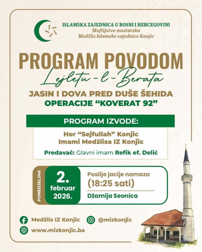 U organizaciji Medžlisa Islamske zajednice Konjic, u ponedjeljak, 2. februara 2026. godine, u džamiji Seonica, bit će održan vjerski program povodom Lejletu-l-berata, uz jâsin i dovu pred duše šehida Operacije „Koverat 92“.