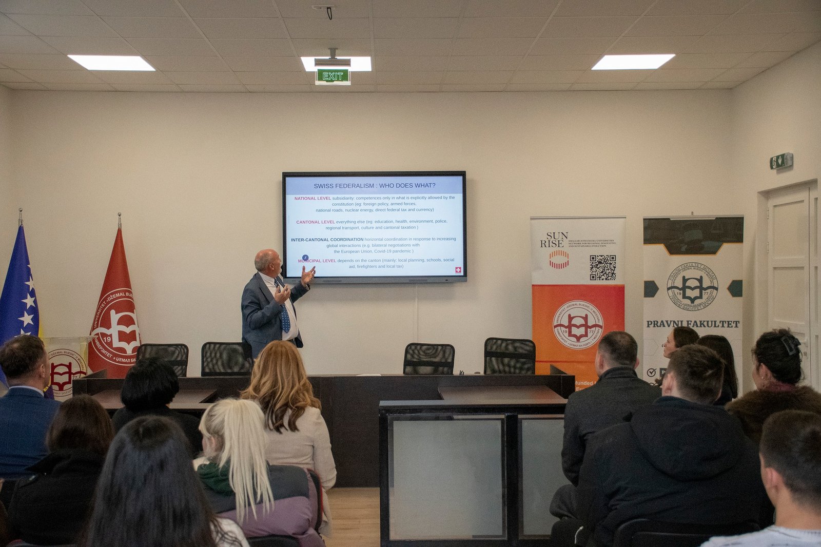 Ambasador Derighetti posjetio je i Pravni fakultet Univerziteta “Džemal Bijedić” u Mostaru, gdje je u Sali za simulovano suđenje održao predavanje na temu političkog sistema Švicarske. Kroz interaktivan pristup i konkretne primjere, studentima je približio ključne principe poput federalizma, direktne demokratije, decentralizacije vlasti i visokog nivoa građanskog učešća u donošenju odluka.