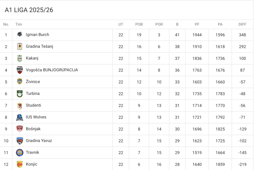 U nastavku vam donosimo tabelu A1 lige FBIH 2025/26.