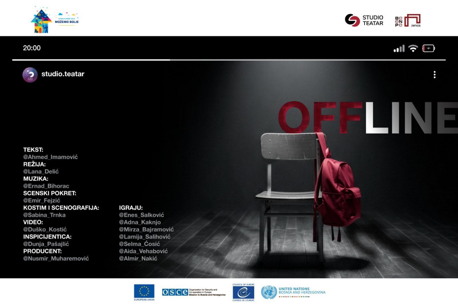 Riječ je o predstavi nastaloj prema tekstu Ahmeda Imamovića, u režiji Lane Delić, koja kroz snažan scenski izraz tematizira izazove savremenog društva, s posebnim fokusom na online nasilje, porodične odnose i sve prisutniji jaz između stvarnog i virtualnog identiteta.