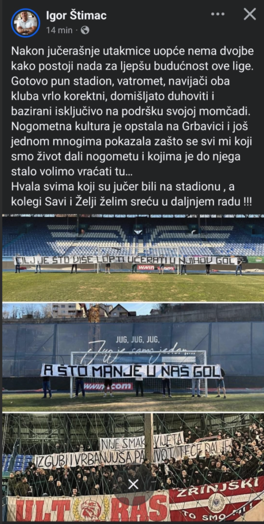 Trener Zrinjskog, Igor Štimac, oglasio se na društvenim mrežama nakon sinoćnje pobjede na Grbavici rezultatom 3:1