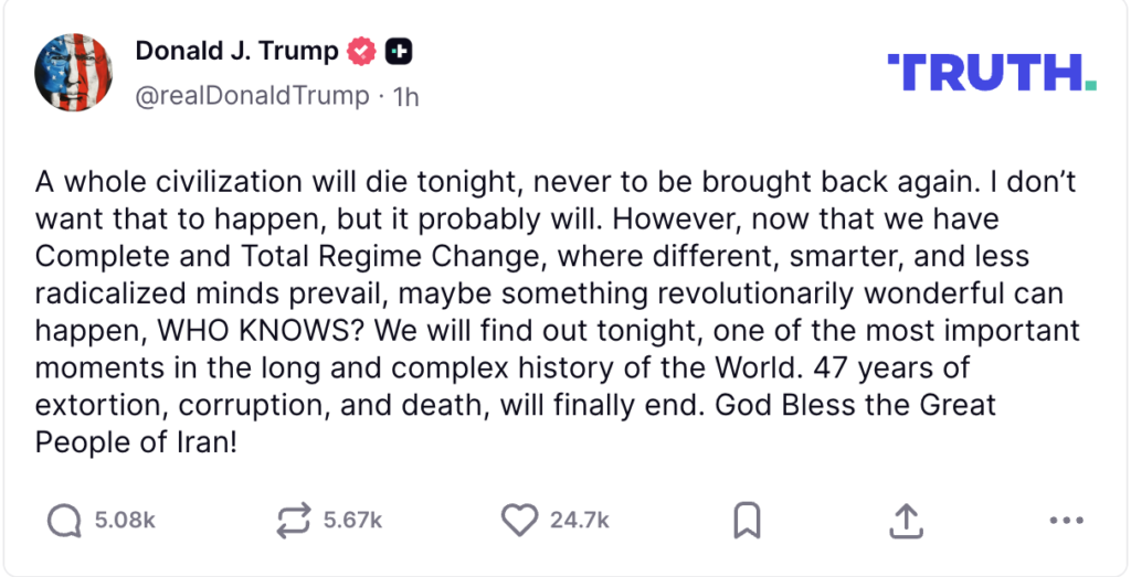 Američki predsjednik Donald Trump oglasio se na društvenoj mreži Truth Social dramatičnom porukom uoči isteka ultimatuma kojeg je postavio Iranu.